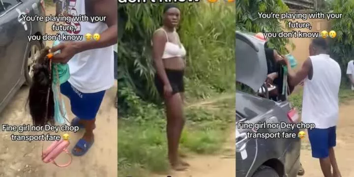 A beautiful Nigerian lady was publicly embarrassed as a Nigerian man collected her bag, wig, dresses, and slippers on the road after she failed to show up at his house despite him sending her T-Fare.